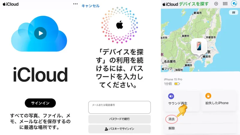 ・PCやスマホで iCloud.com にアクセス→自分のApple IDでログイン→探す→デバイス一覧から該当のiPhoneを選択→消去