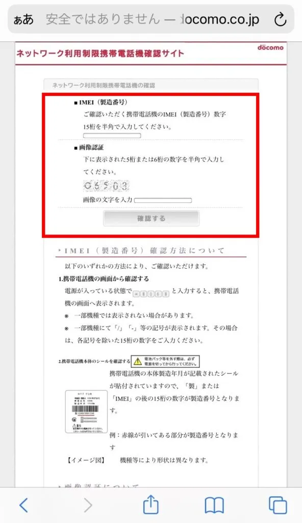 3.「IMEI(製造番号) 」「画像認証」を入力する