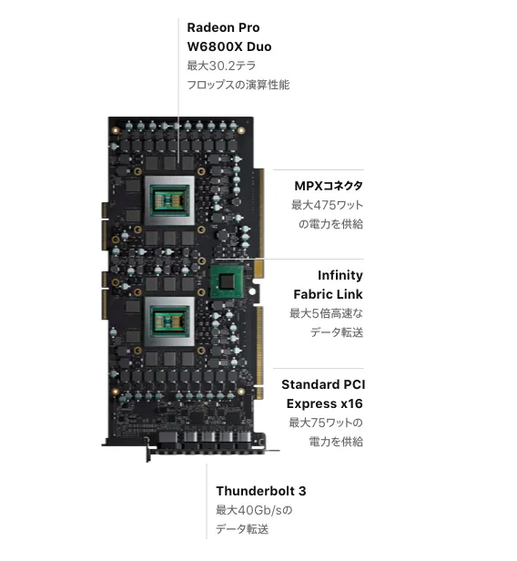 MacProにおける最大の特徴は、映像処理速度が劇的に速いことです。これは、映像の編集や再生時にブースターとなる「Apple Afterburner」というアクセラレーターカードによるものです。
