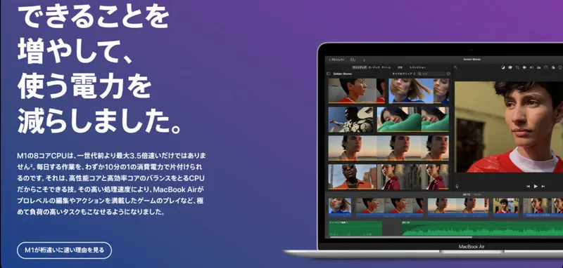 高スペックのMacBook Air(M1)なら動画編集もスムーズにこなせます。「動画編集ならMacBook Pro」という従来のイメージを一新し、本製品を動画編集用に購入する方も増えているようです。