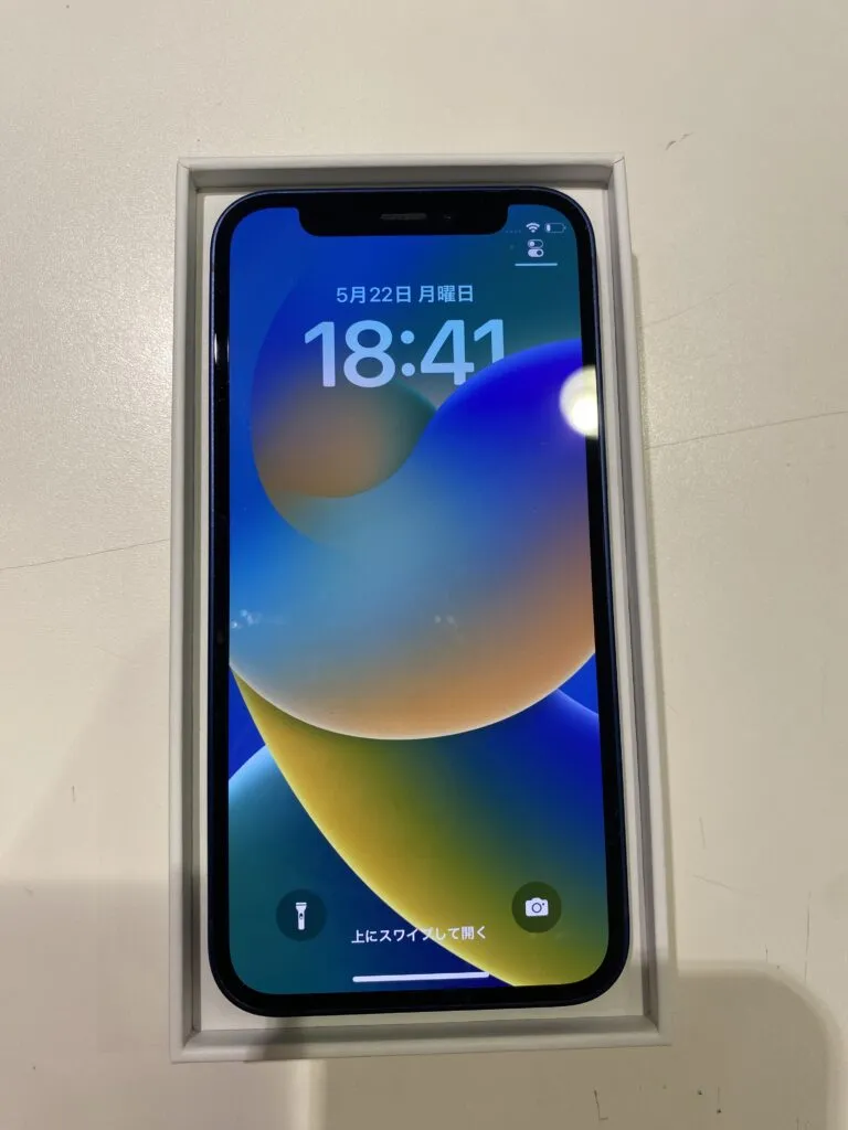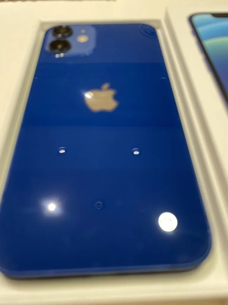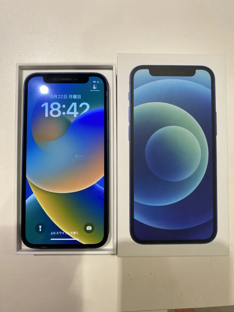 お買取した端末は『iPhone12mini 64GB 中古 本体 箱 新品付属品、docomo○ Blue』でございます。