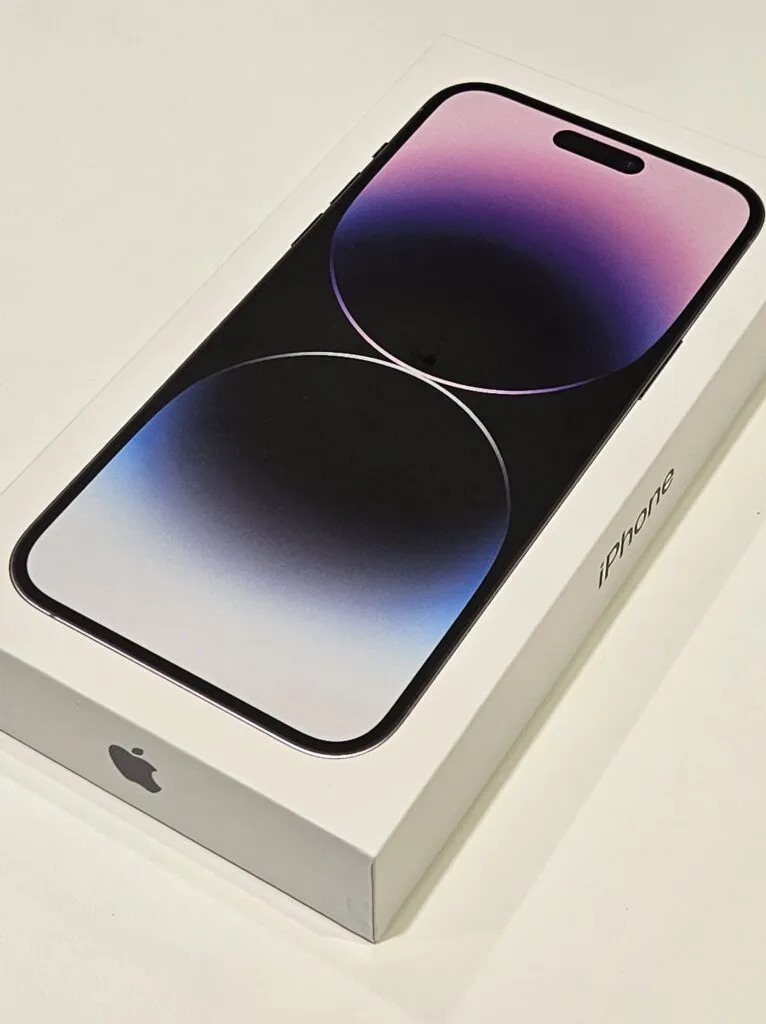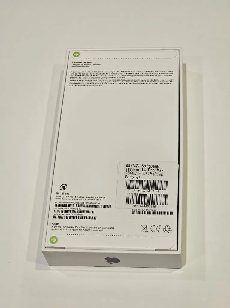 お買取した端末は『iPhone14 Pro max 256GB パープル Softbank△ 新品未開封』でございます。