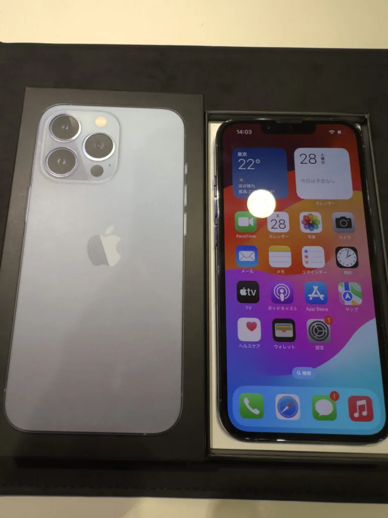 お買取した端末は『iPhone13Pro 256GB シエラブルー 中古 本体 箱 有り 海外モデル版』でございます。
