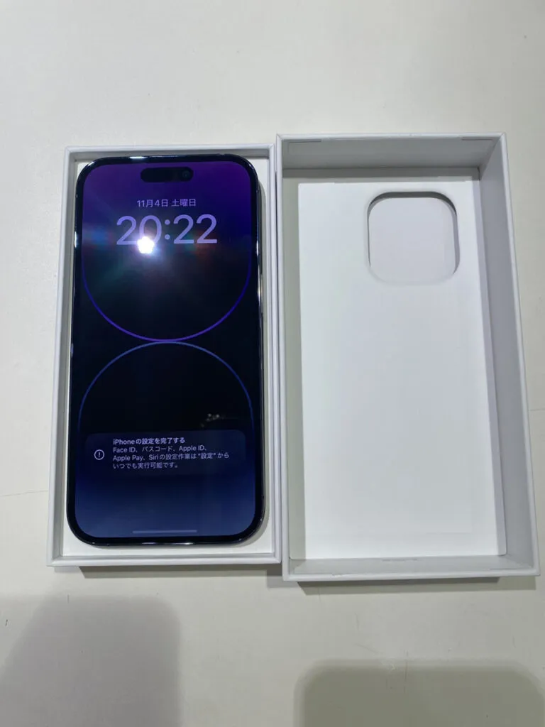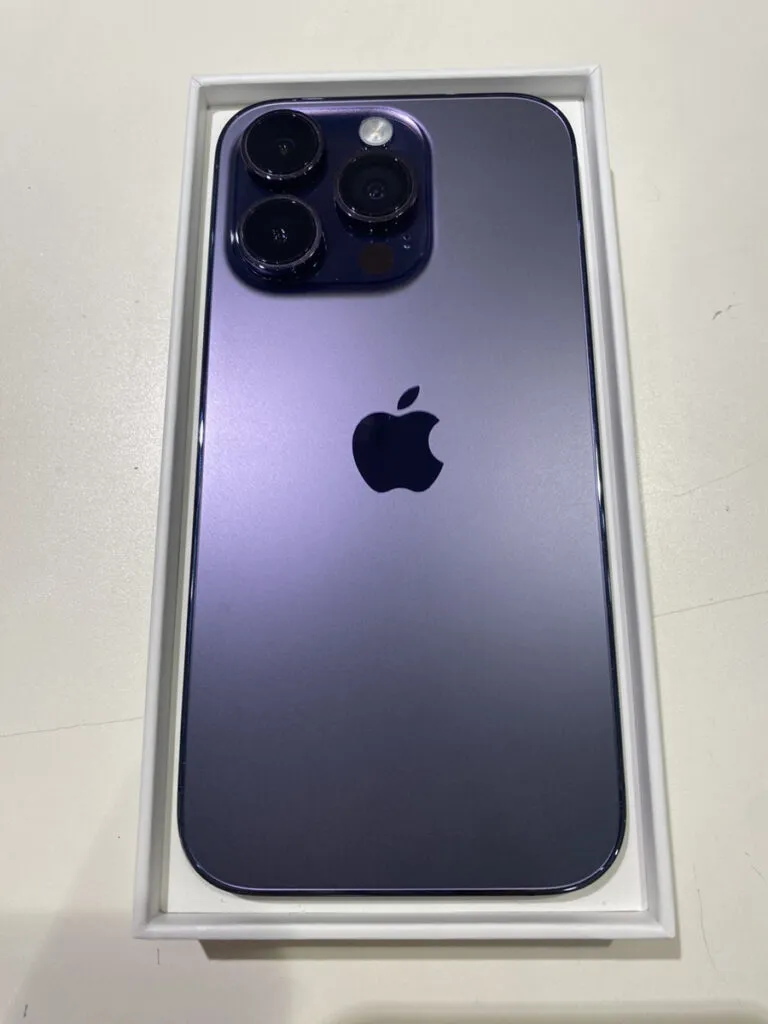 お買取した端末は『iPhone14Pro 256GB ディープパープル 中古 本体 箱有り Apple Simフリー』でございます。