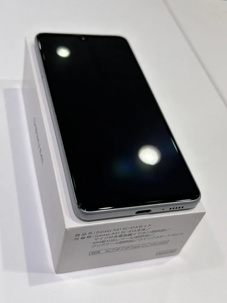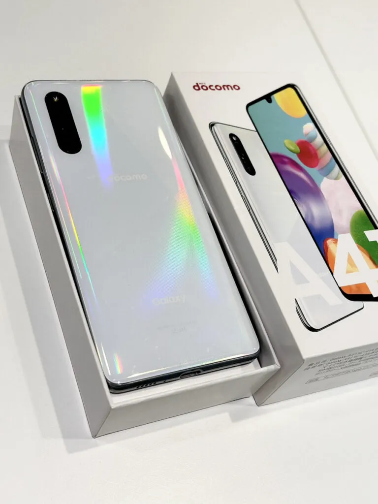 お買取した端末は『Galaxy A41 64GB ホワイト 中古 本体 箱 docomo○』でございます。