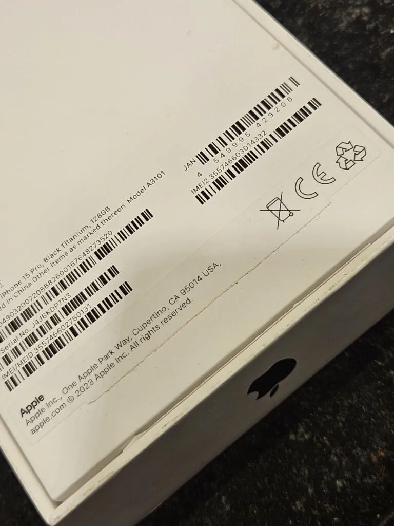 お買取した端末は『iPhone15Pro 128GB ブラックチタニウム docomo△ 箱あり・中古付属品』でございます。