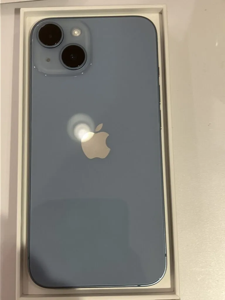お買取した端末は『iPhone14 256GB ブルー 新品未使用、AppleSIMフリー』でございます。