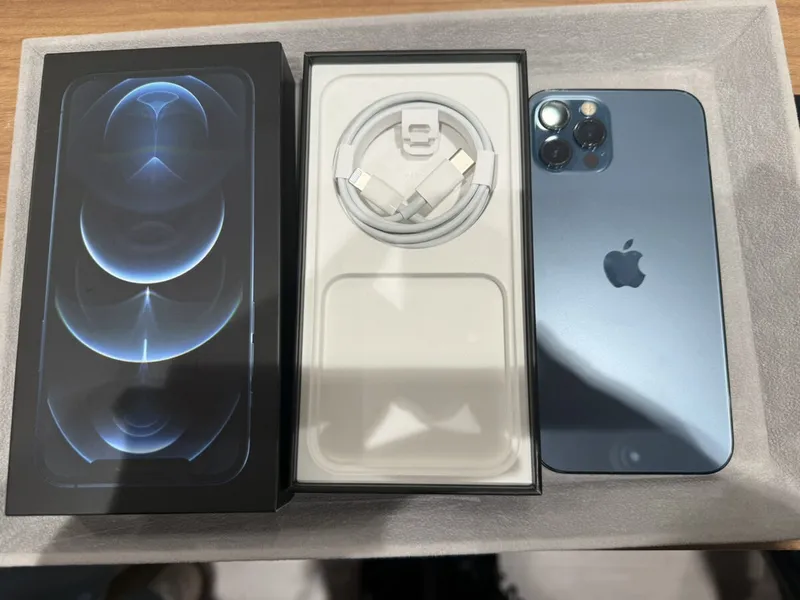 お買取した端末は『iPhone12 256GB ブルー 中古箱あり 付属品あり、docomo〇』でございます。