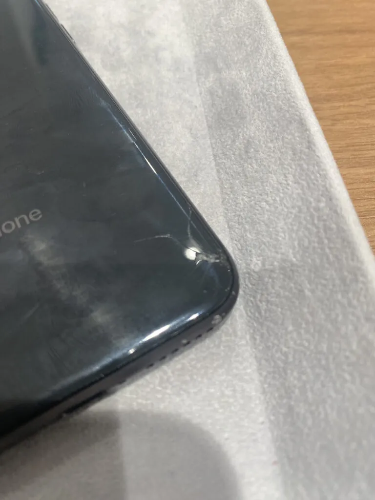 背面には大きく割れが入っており、画面には傷が複数、フレームは凹みが多数ある
