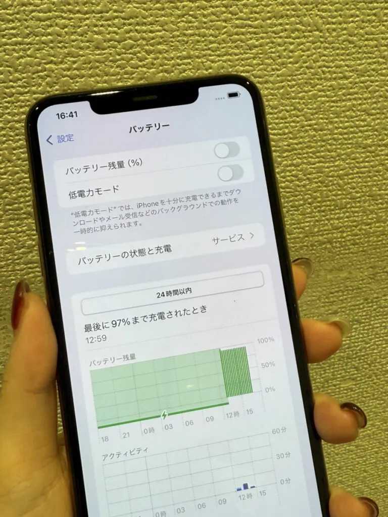 バッテリーの最大容量は本体設定のバッテリーから確認することができます。
