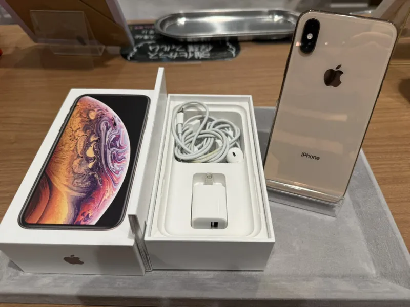 お買取した端末は『iPhoneXS 64GB GD docomo〇 中古箱あり 擦り傷あり SIMロックあり』でございます。