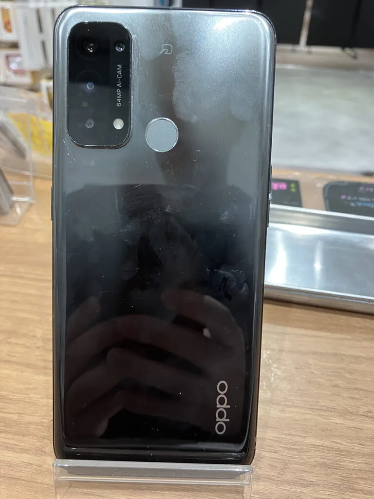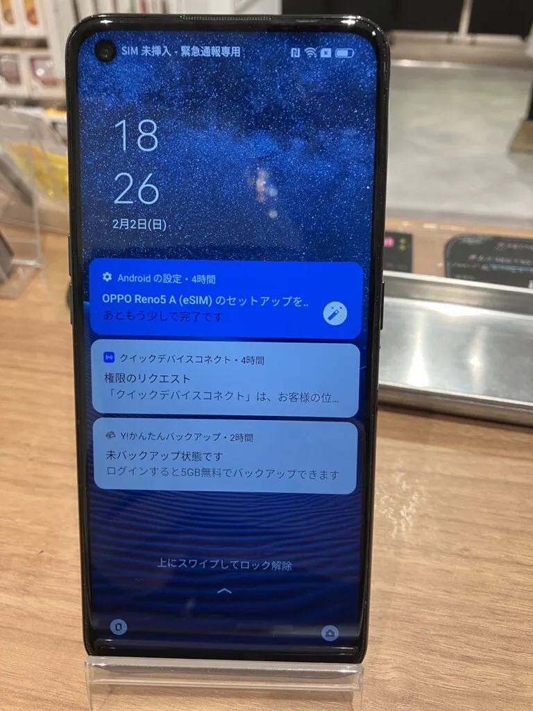お買取した端末は『OPPO Reno5A 128GB ブラック中古本体のみ Softbank〇』でございます。