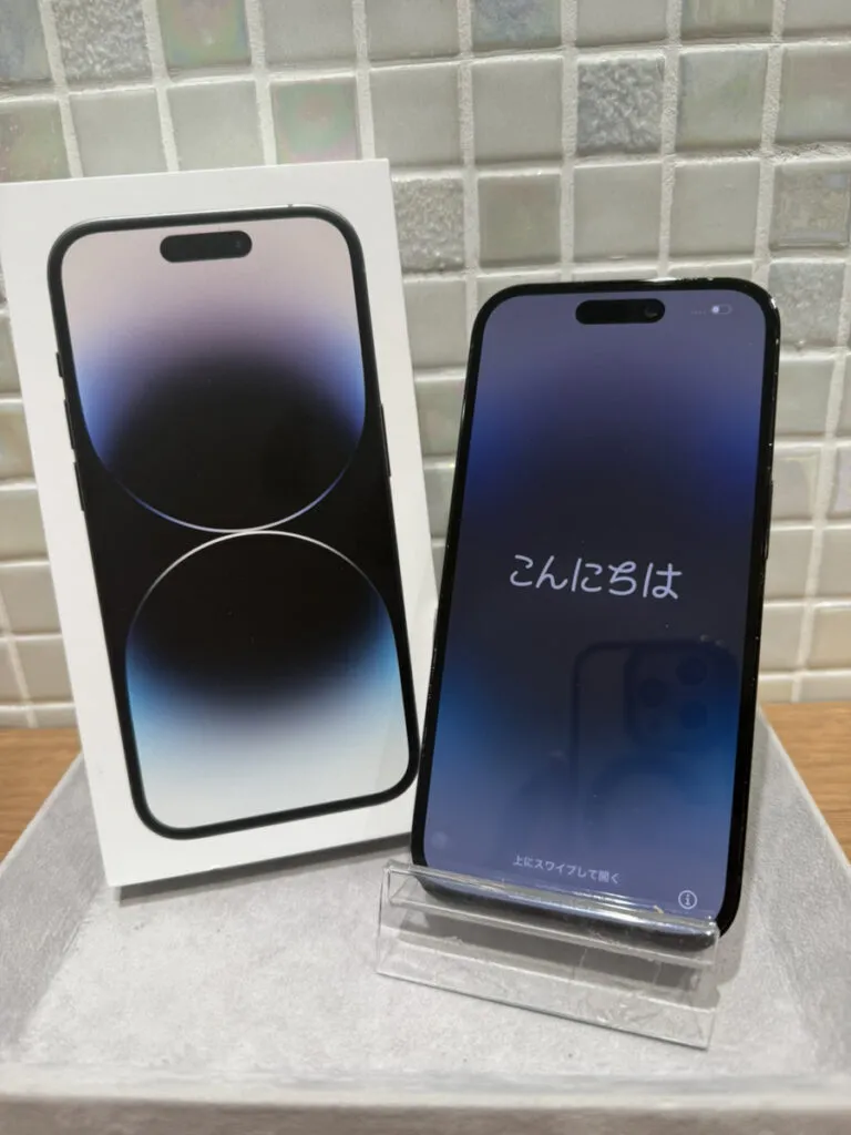 お買取した端末は『iPhone14Pro 256GB au△ 黒点あり 箱付属品あり』でございます。