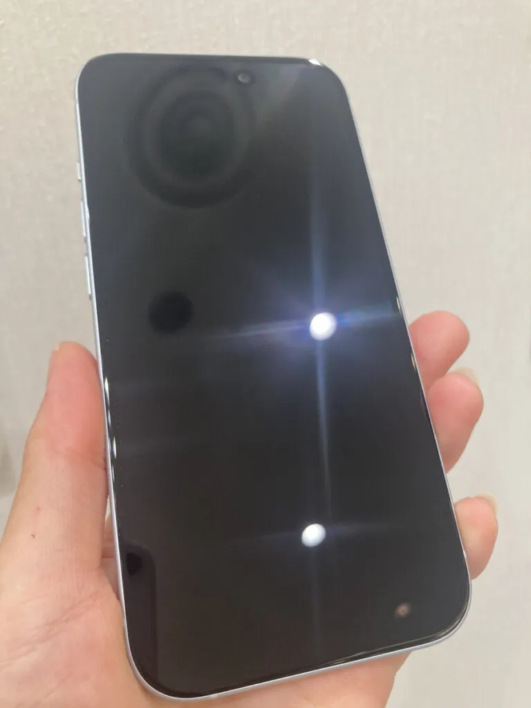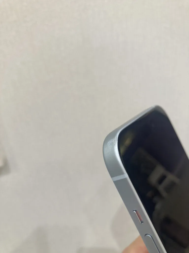 iPhone15はフレームに大きな凹みがありますが、画面や背面に目立つ傷はありませんでした。