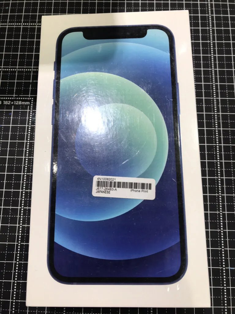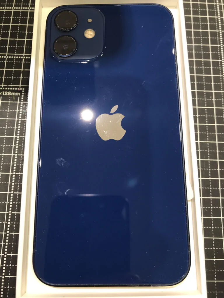 お買取した端末は『iPhone12mini 64GB ブルー 本体、箱 SB〇』でございます。