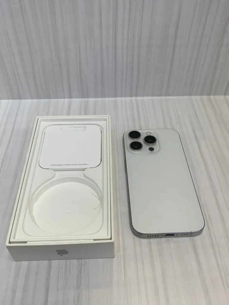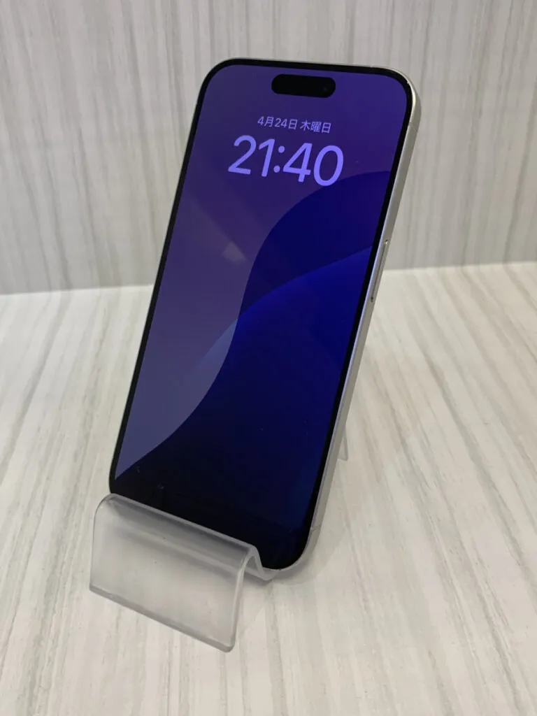 お買取した端末は『iPhone15Pro 128GB 中古 本体 箱 付属品なし、ホワイトチタニウム』でございます。