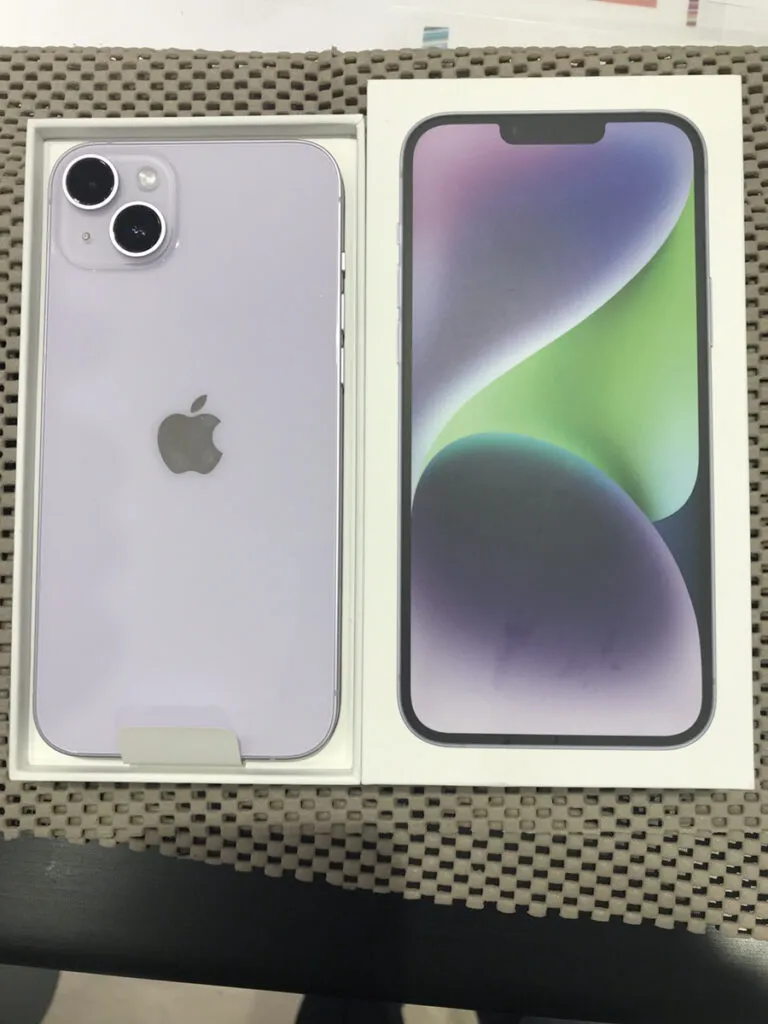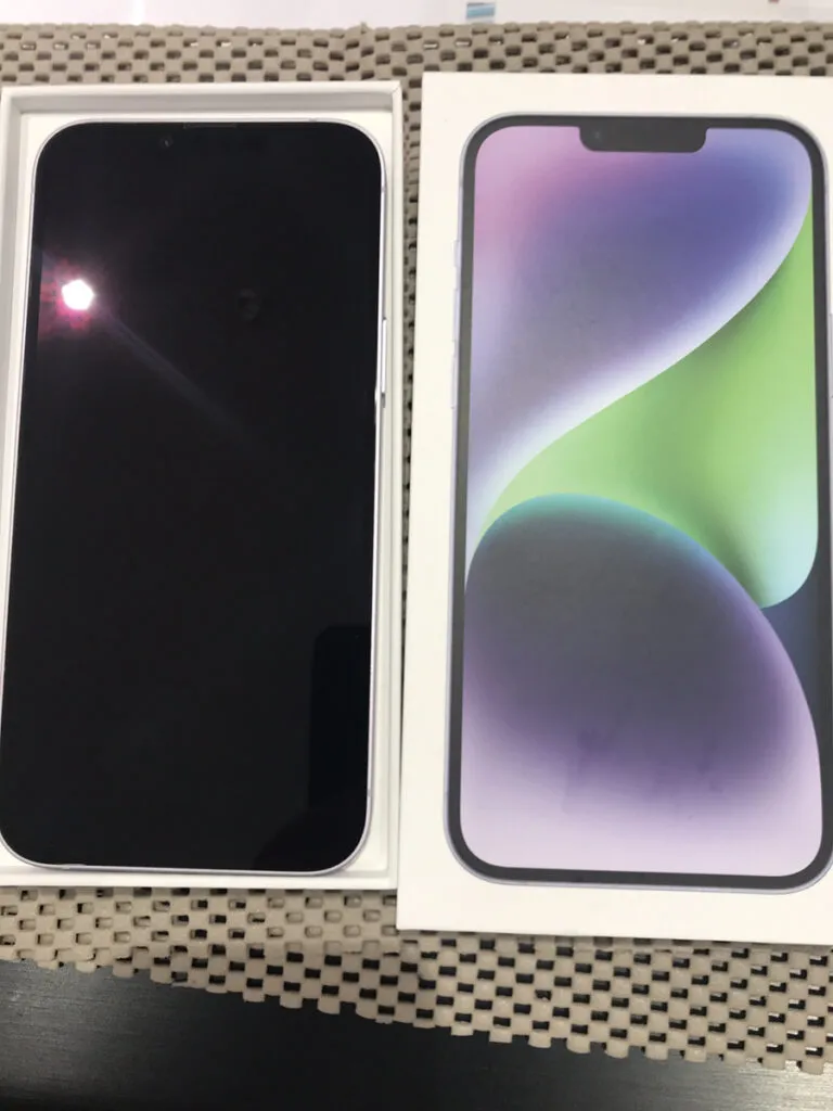 お買取した端末は『iPhone14Plus 256GB パープル 中古 SIMフリー』でございます。