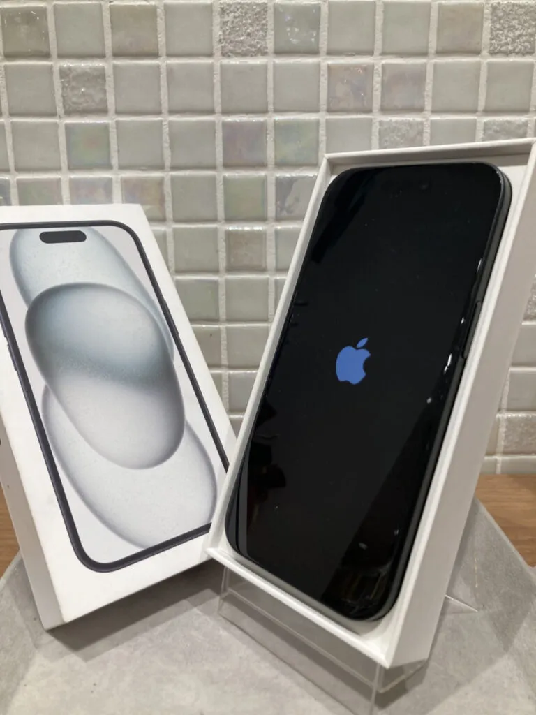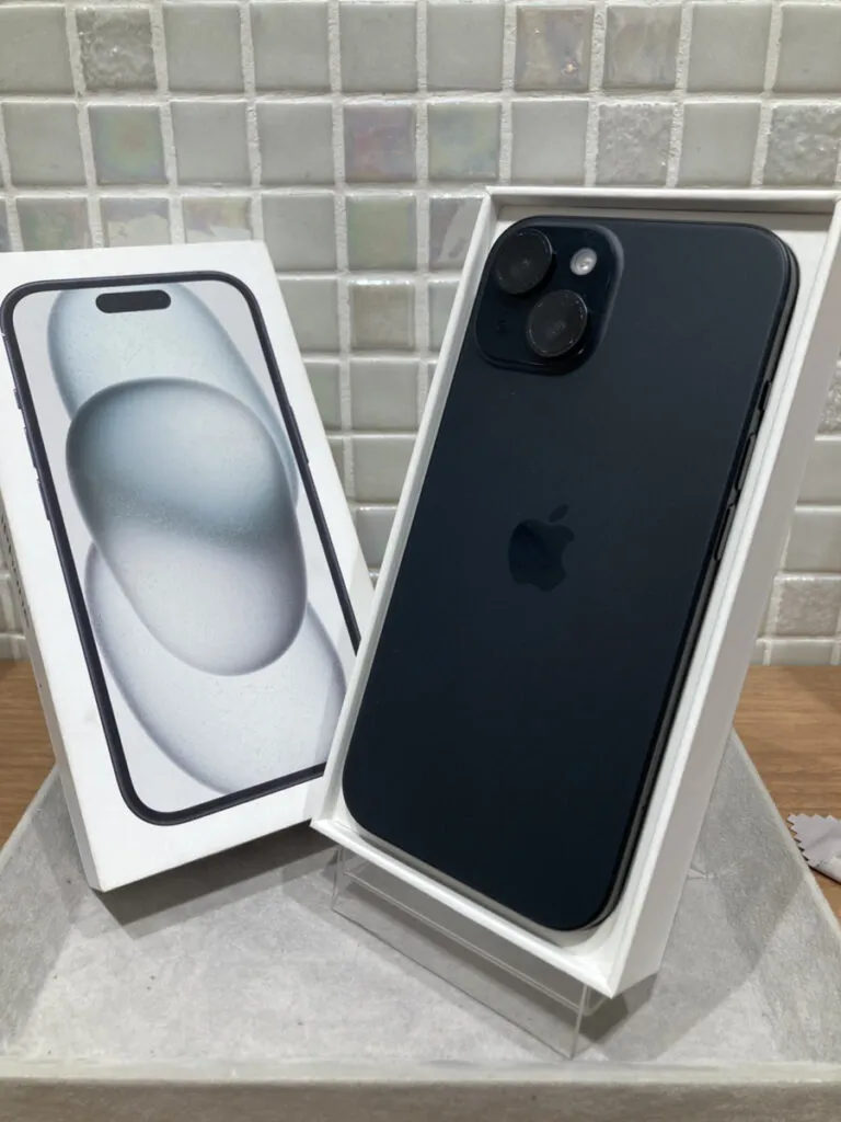 お買取した端末は『iPhone15 128GB au△ 中古箱あり』でございます。