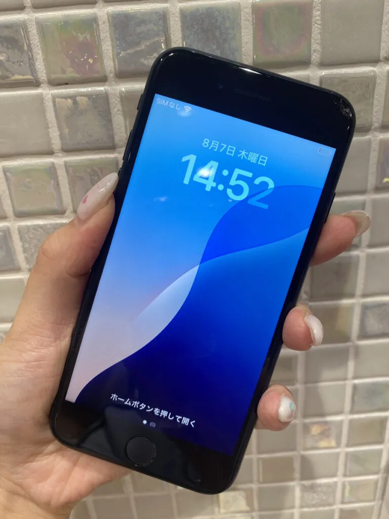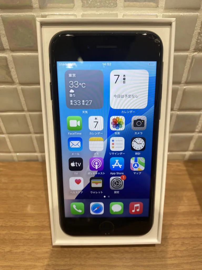 お買取した端末は『iPhoneSE第3世代 64GB SB△ 箱あり付属品なし、画面割れあり』でございます。