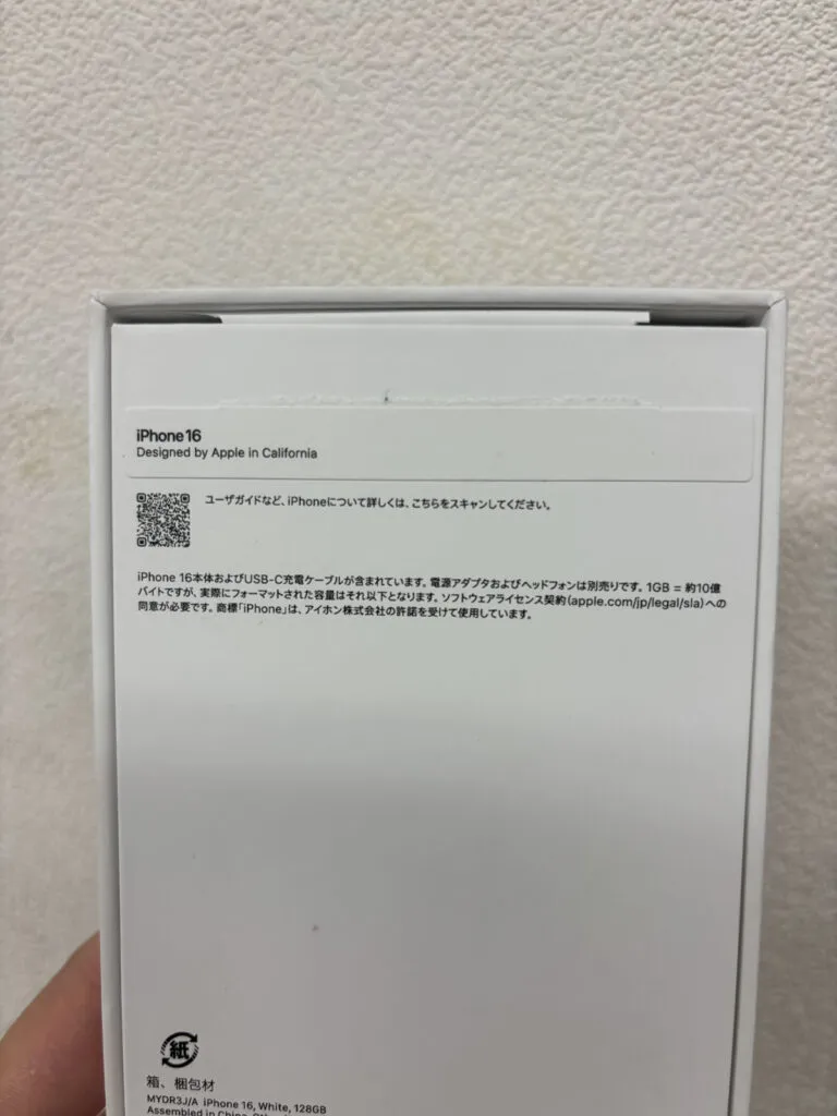 今回のお買取端末は『iPhone16 128GB ホワイト SB △ 開封済み新品未使用』でございます。