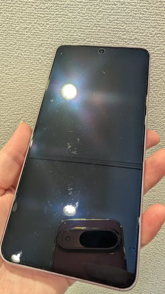 今回は画面上に貼ってある保護シートには多少傷があるものの、本体ディスプレイ自体には傷がなく、比較的綺麗な状態でした。