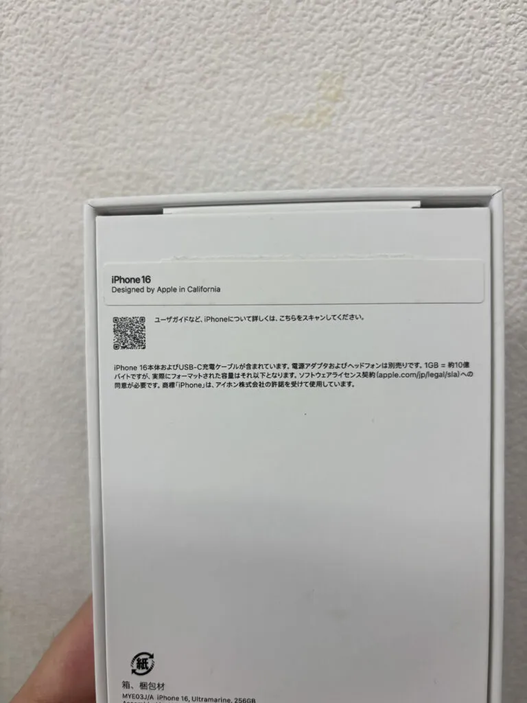 今回のお買取端末は『iPhone16 256GB ウルトラマリン SIMフリー 中古傷なし 箱あり付属品なし』でございます。