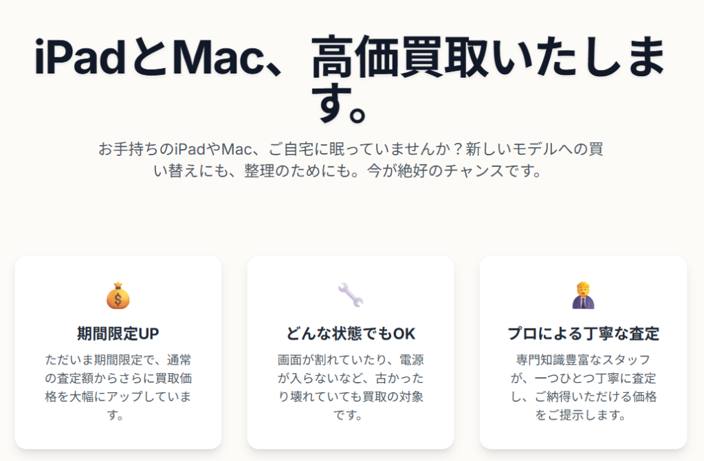 ブランドや貴金属の買取はやっておらず、 iPhoneやAndroidのスマートフォンやiPadなどタブレットの買取に集中することによって、 スピード買取・多店舗展開・高額買取を実現しております。